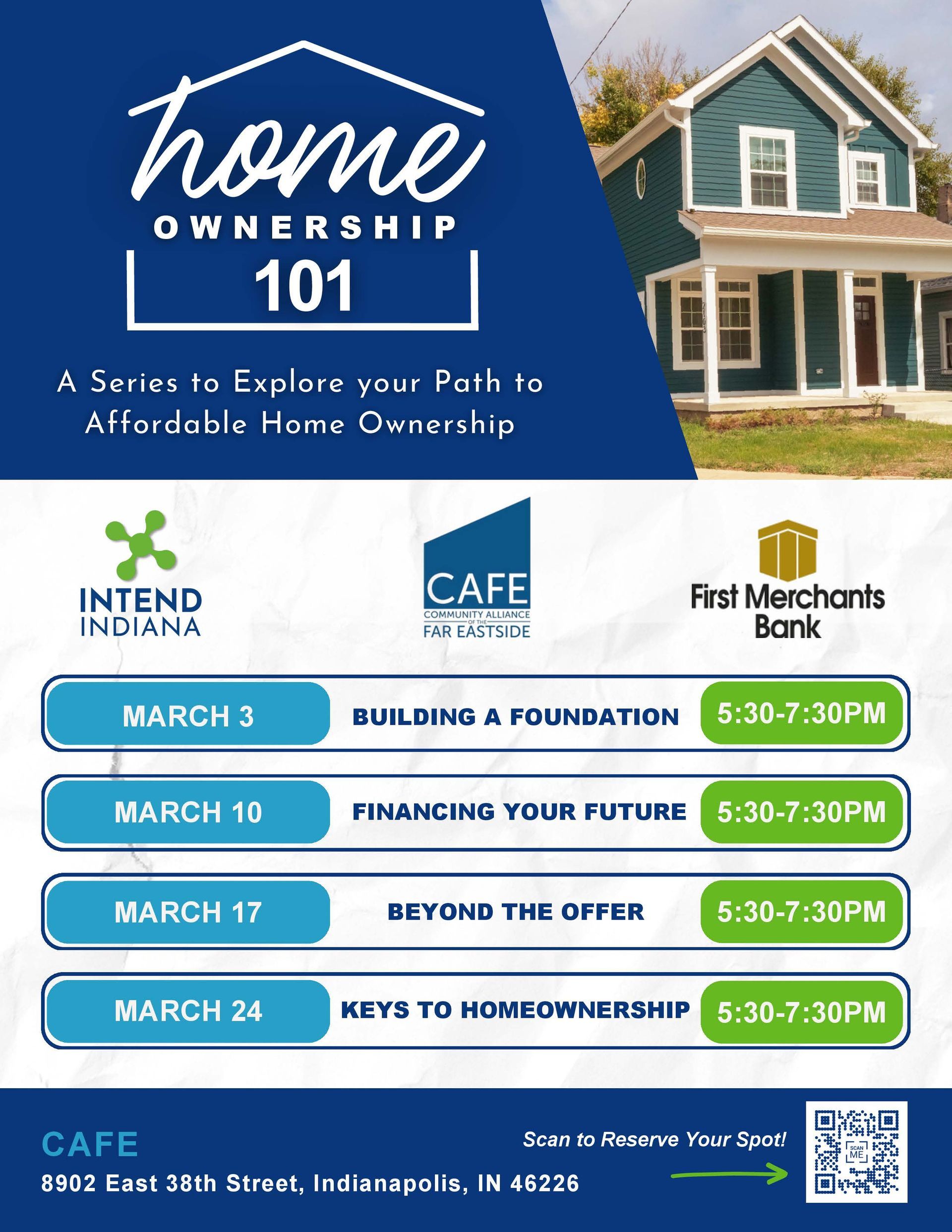 First Merchants Bank, Intend Indiana, and CAFE are offering FREE March Homeownership 101 sessions to help Far Eastside residents learn budgeting, credit, and the full path to successful homeownership.