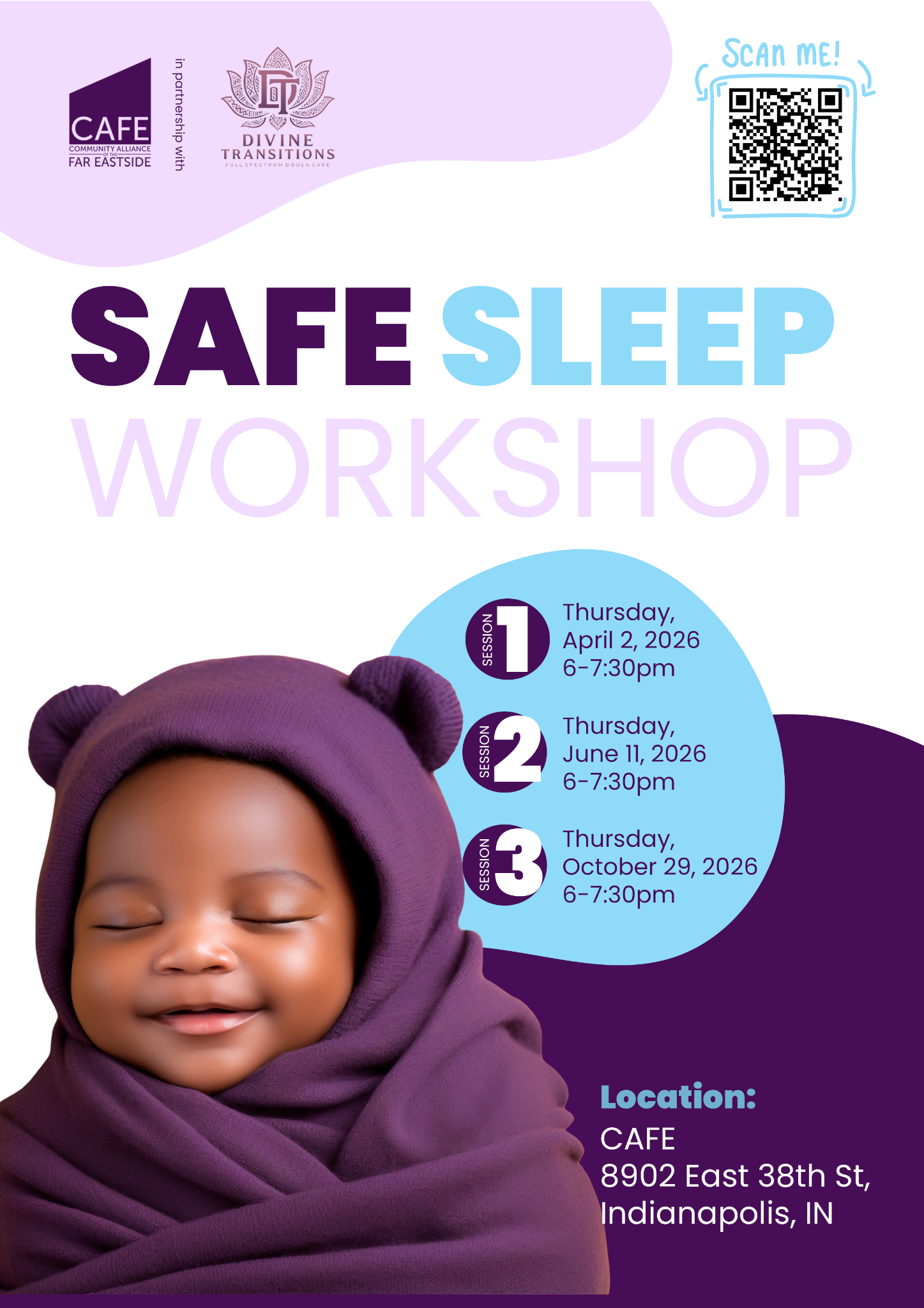 Join CAFE and Divine Transitions for a FREE Safe Sleep Workshop for expecting parents and caregivers. Learn simple, life‑saving practices to reduce the risk of sleep‑related infant deaths and keep your baby comfortable and safe at nap time and overnight.